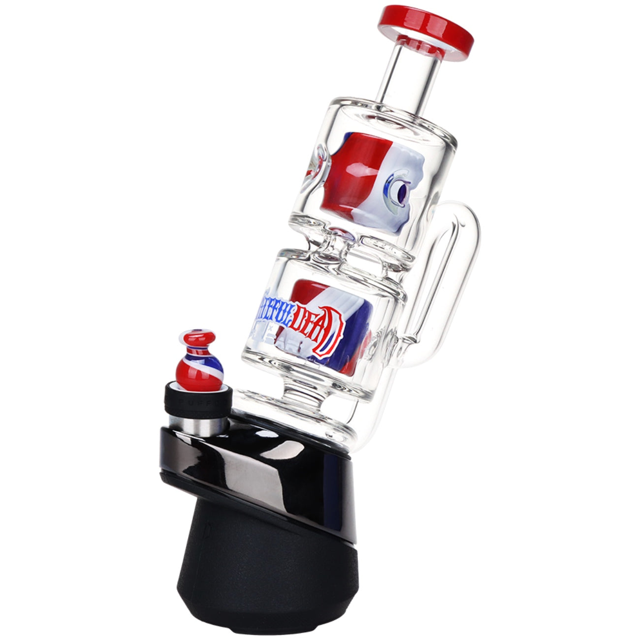 Get your groove on with the Grateful Dead Stealied Out Puffco Peak Attachment, a vibrant collaboration piece from Pulsar and the Dead that hits as smooth as your favorite jam. This eye-catching recycler attachment brings red, white, and blue flair to your setup, complete with the Grateful Dead’s signature style and a matching bubble carb cap for the full encore.