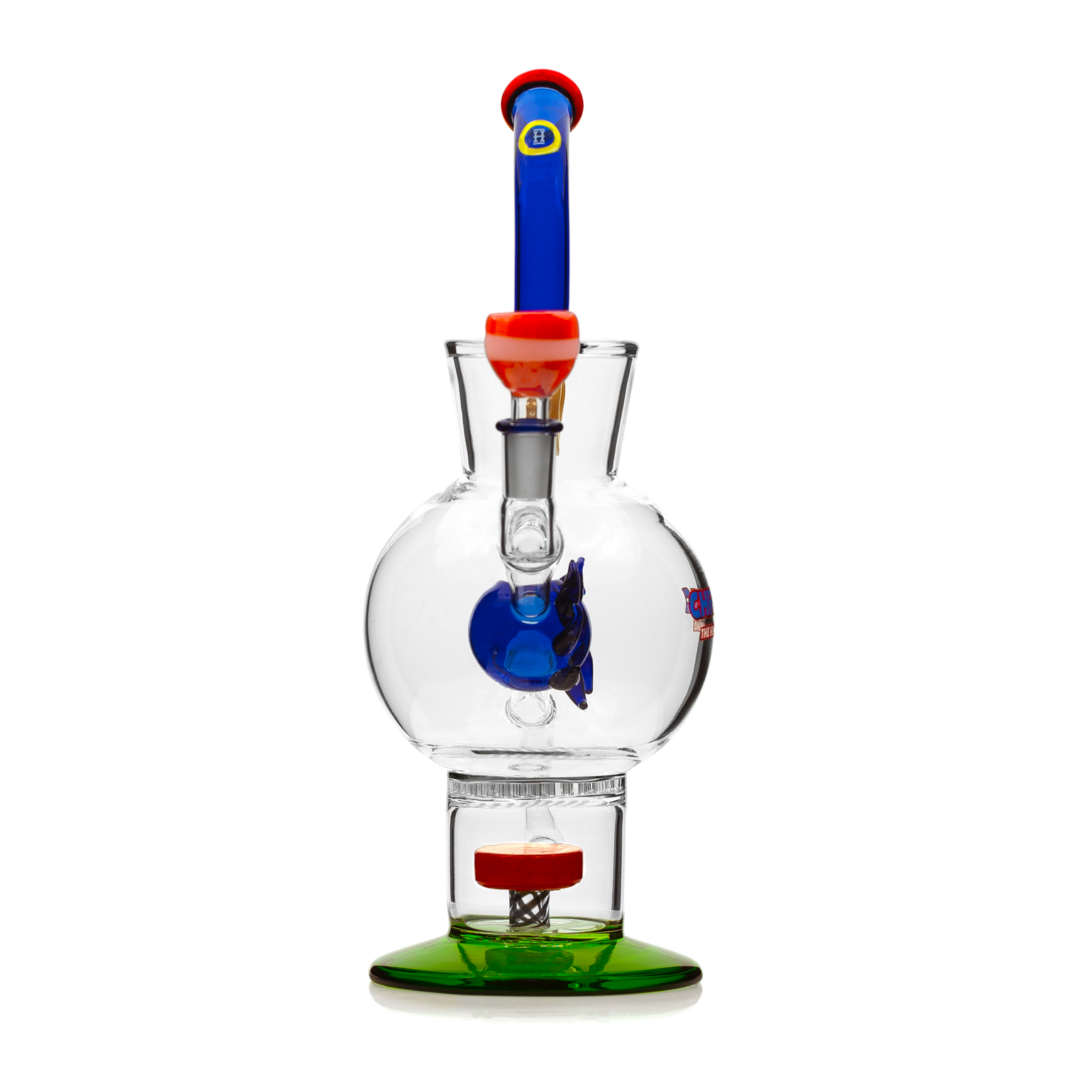 It’s game time. The Hemper XL Chronic Bong takes you straight back to the golden age of 90s gaming with upgraded graphics and way better rewards. Standing 10” inches tall, this glass bong features a triple stacked percolator system that filters smoke faster than you can say “Level Up.” A colored spring board circ perc in the very bottom gets things started and works in combination with the 70+ hole honeycomb percolator just above it for unmatched water filtration. As if that wasn’t enough, the blue spiky ball perc redirects each hit and adds a spinning effect to your smoke inside the main chamber.