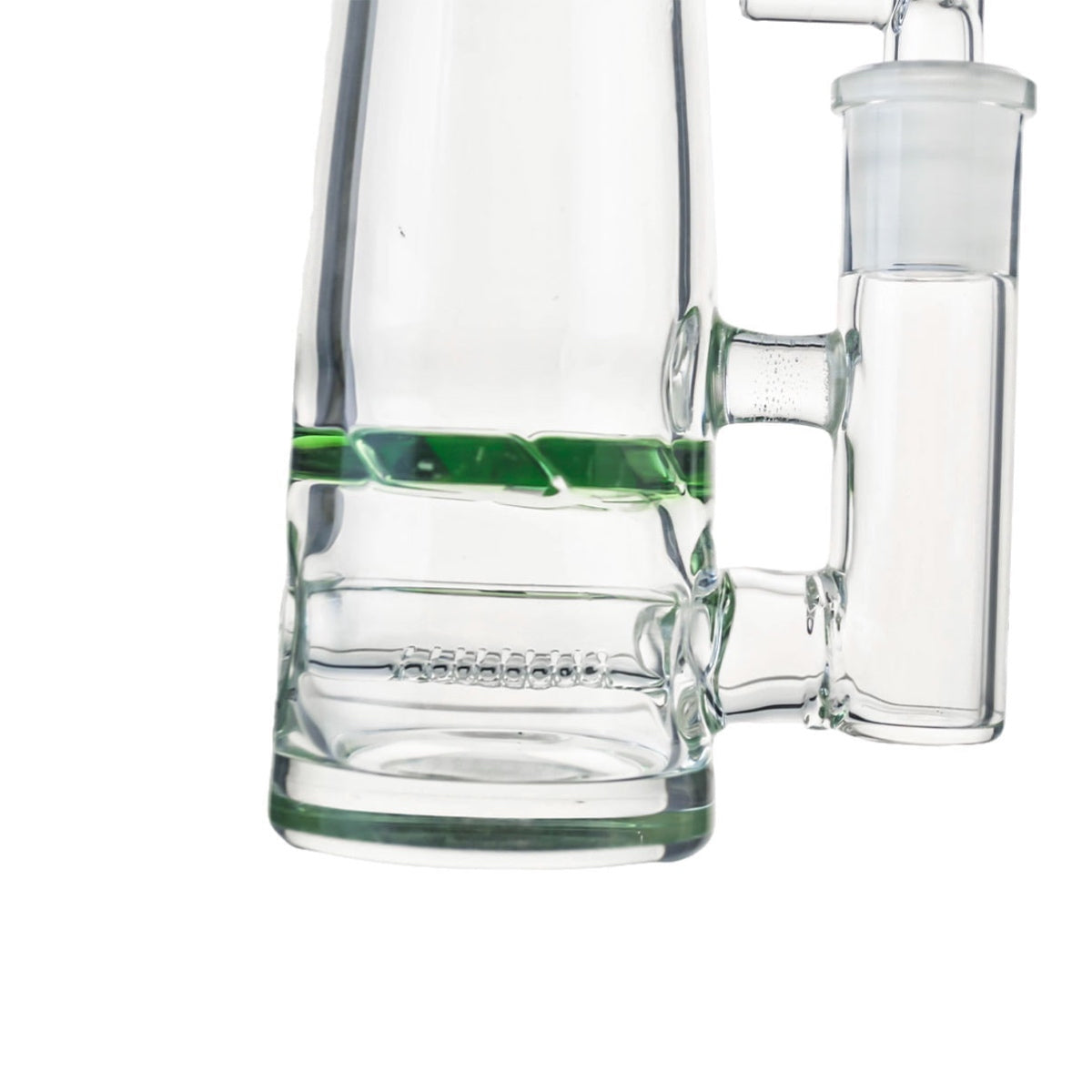 The Giggles is the perfect addition to any bong enthusiast's collection, offering smooth and powerful hits. This 12” inch water pipe features a unique vase body that is thin at the top and becomes wider at the base, making it stable on flat surfaces. The chamber is equipped with an inline perc that diffuses your smoke into many bubbles, and a turbine perc, which further filters your smoke for two layers of effective percolation. Even with all the bubbles and percolation, you can rest assured that the Giggles design will prevent any splashback from reaching your mouth. The Giggles Water Pipe comes with a 14mm male funnel bowl which sits on a fixed downstem. Between the unique design, double percs, and cool accents, this bong is sure to offer high satisfaction.